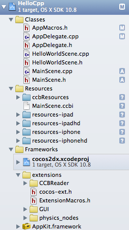 这一段主要是修改HelloCpp默认的资源目录, 配合CCB的发布路径.同时可以将原来几个目录中文件分别移入对应目录.